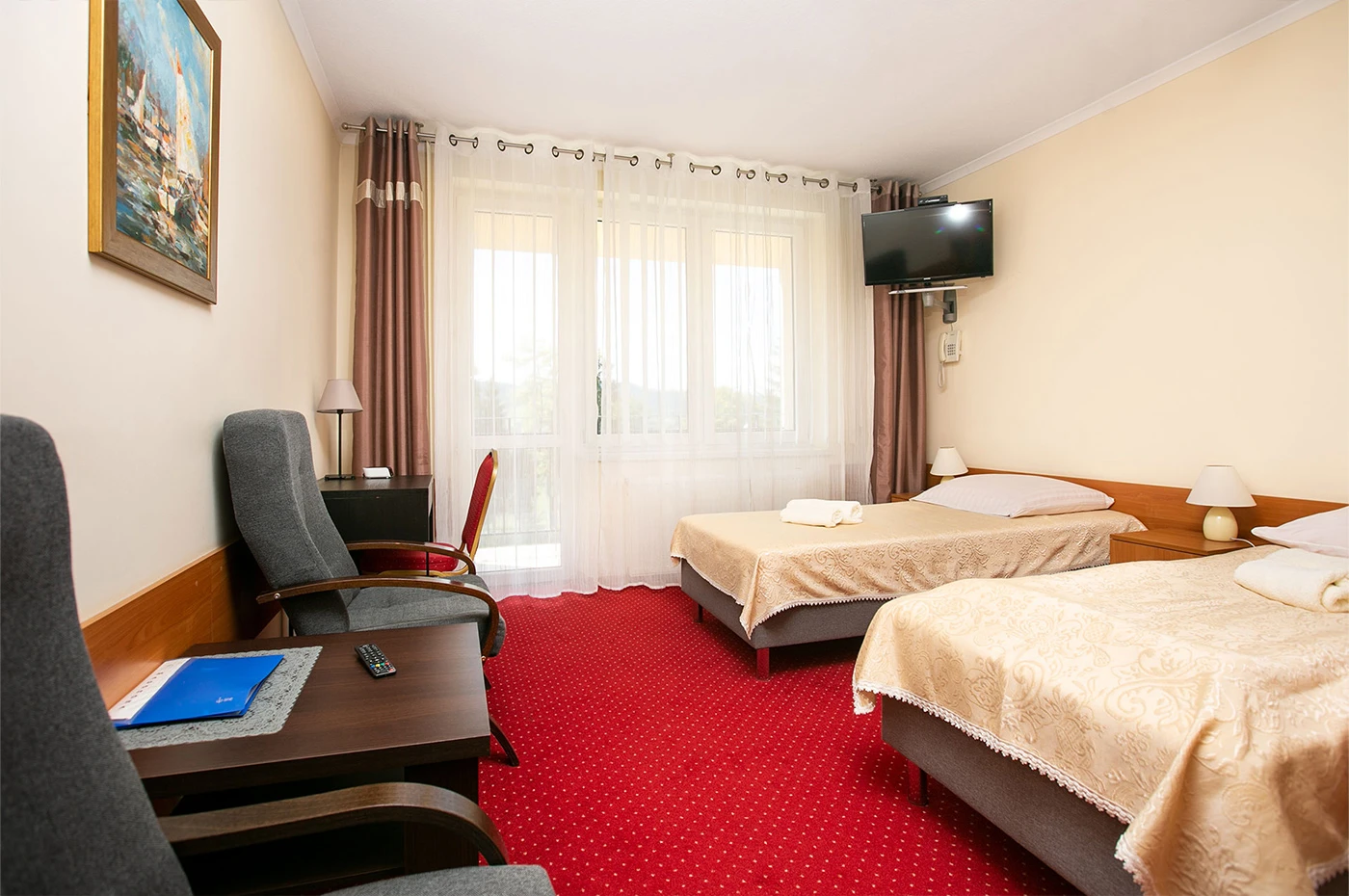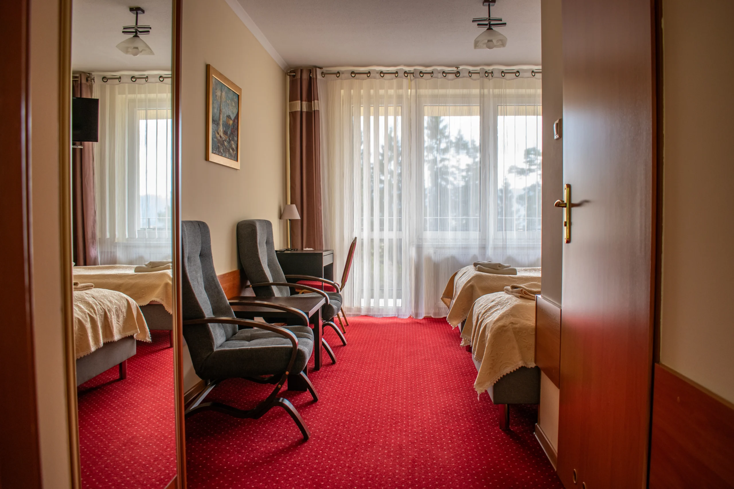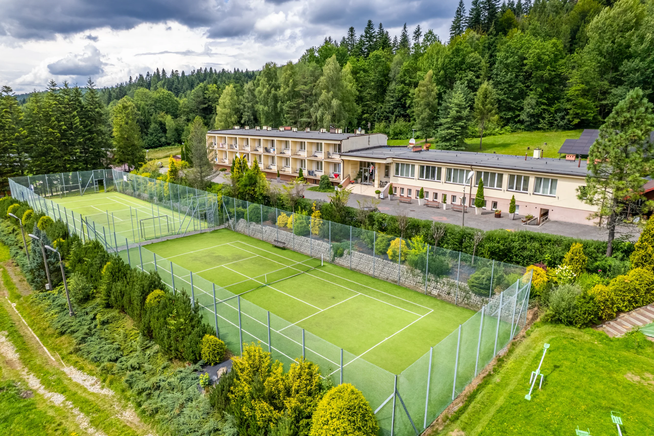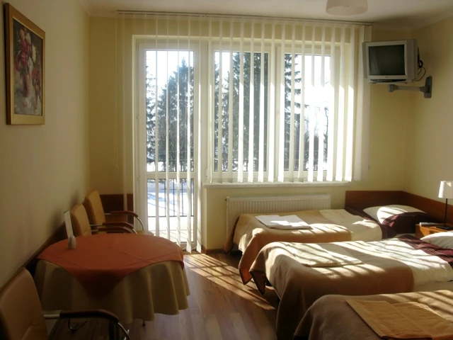 Ośrodek dysponuje 60 miejscami noclegowymi w pokojach typu standard i komfort, jedno-, dwu- i trzyosobowych. Każdy pokój wyposażony jest w łazienkę, telewizor oraz dostęp do internetu WiFi, a większość posiada balkony z widokiem na panoramę Beskidów lub otaczający las. Jeśli zdecydujesz się na wczasy odchudzające w górach u nas, to wiedz, że do dyspozycji gości przygotowano klimatyzowaną Salę Konferencyjno-Restauracyjną dla 80 osób oraz Salę Szkoleniowo-Wypoczynkową z kominkiem mieszczącą do 40 osób. W obiekcie działa recepcja, kącik Internet-Cafe z dwoma stanowiskami komputerowymi oraz 12 przewodowych punktów podłączenia. Stały dostęp do WiFi obejmuje cały teren ośrodka, a rozwiązania architektoniczne i techniczne zapewniają wygodę także osobom z niepełnosprawnościami. To idealne miejsce na wczasy odchudzające w górach!